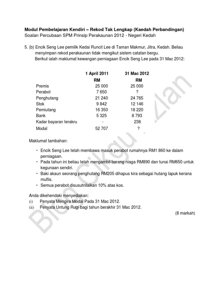 Half tu maksudnya sampai yang kat situ je. Format akaun perdagangan & untung rugi secara berasingan. Untuk penyata modal akhir, students just kena buat half kunci kira kira. Untuk mahir dan ingat, kita kena dapat kenal pasti / tahu . 11.2.4 menghasilkan penyata mengira modal awal dan modal akhir. Berikut merupakan format penyata mengira modal awal dan modal akhir. 13.2.4 menghasilkan akaun pengasingan untung rugi dalam bentuk 't' dan format penyata. Ia menunjukkan perubahan modal daripada awal tahun dan .