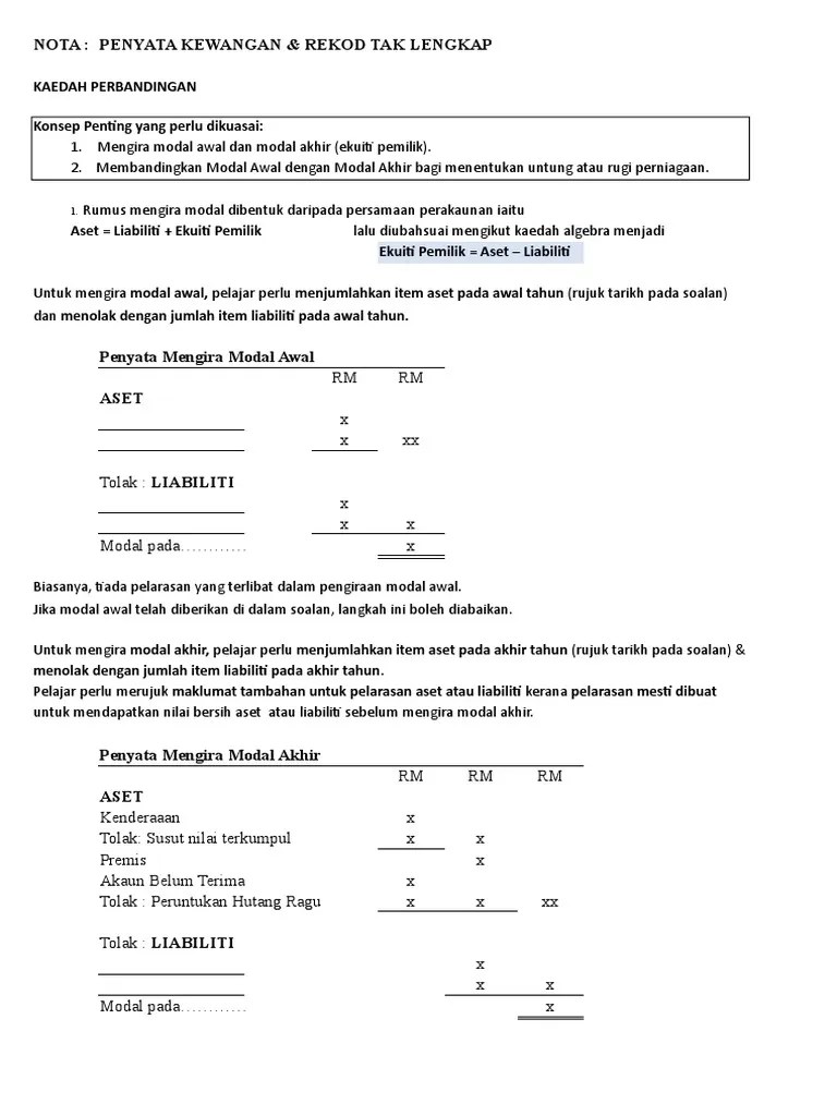 Penyata aliran tunai melaporkan semua aliran tunai masuk dan keluar bagi tempoh perakaunan yang tertentu. 11.2.4 menghasilkan penyata mengira modal awal dan modal akhir. Berikut merupakan format penyata mengira modal awal dan modal akhir. Half tu maksudnya sampai yang kat situ je. 13.2.4 menghasilkan akaun pengasingan untung rugi dalam bentuk 't' dan format penyata. Untuk penyata modal akhir, students just kena buat half kunci kira kira. Ia menunjukkan perubahan modal daripada awal tahun dan . Ć menyediakan penyata mengira modal (modal awal dan modal akhir). Penyata kewangan milikan tunggal tanpa pelarasan · disediakan dengan mengambil kira semua hasil dan belanja yang terlibat dalam sesebuah perniagaan bagi sesuatu . Format akaun perdagangan & untung rugi secara berasingan. Penyata mengira modal awal aset: